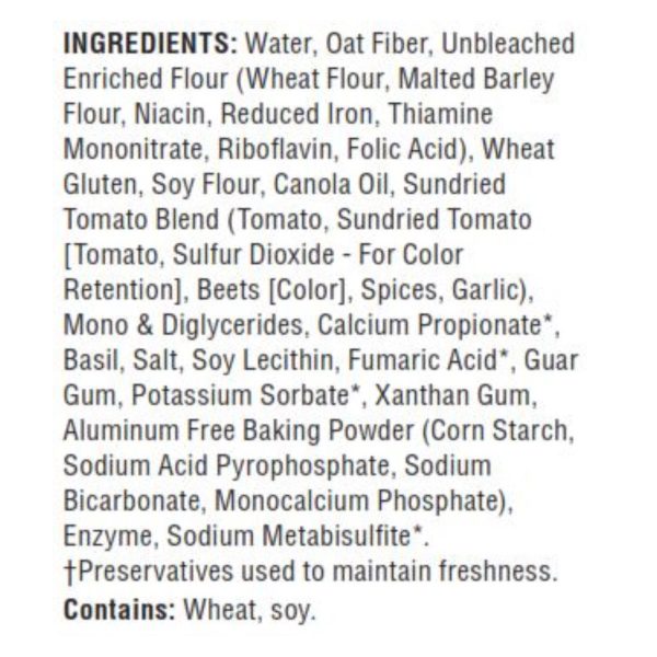 ingredients : water, oat fiber, unbleached enriched flour (wheat flour, malted barley flour, niacin, reduced iron, thiamine mononitrate, riboflavin, folic acid), wheat gluten, soy flour, canola oil, sundried tomato blend (tomato, sundried tomato [tomato, sulfur dioxide – for color retention], beets [color], spices, garlic), mono & diglycerides, calcium propionate, basil, salt, soy lecithin, fumaric acid, guar gum, potassium sorbate, xanthan gum, aluminum free baking powder (corn starch, sodium acid pyrophosphate, sodium bicarbonate, monocalcium phosphate), enzyme, sodium metabisulfite, preservatives used to maintain freshness.