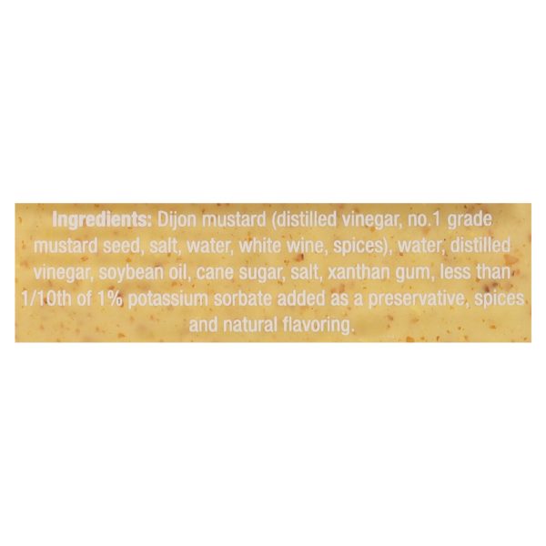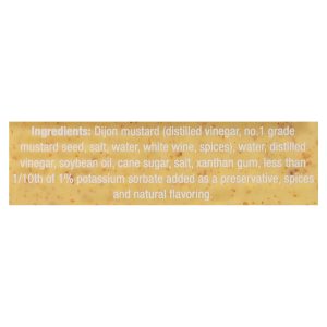 ingredients : dijon mustard (distilled vinegar, no.1 grade mustard seed, salt, water, white wine, spices);water;distilled vinegar;soybean oil;cane sugar;salt;xanthan gum;less than 1/10th of 1% potassium sorbate added as a preservative;spices and natural flavoring