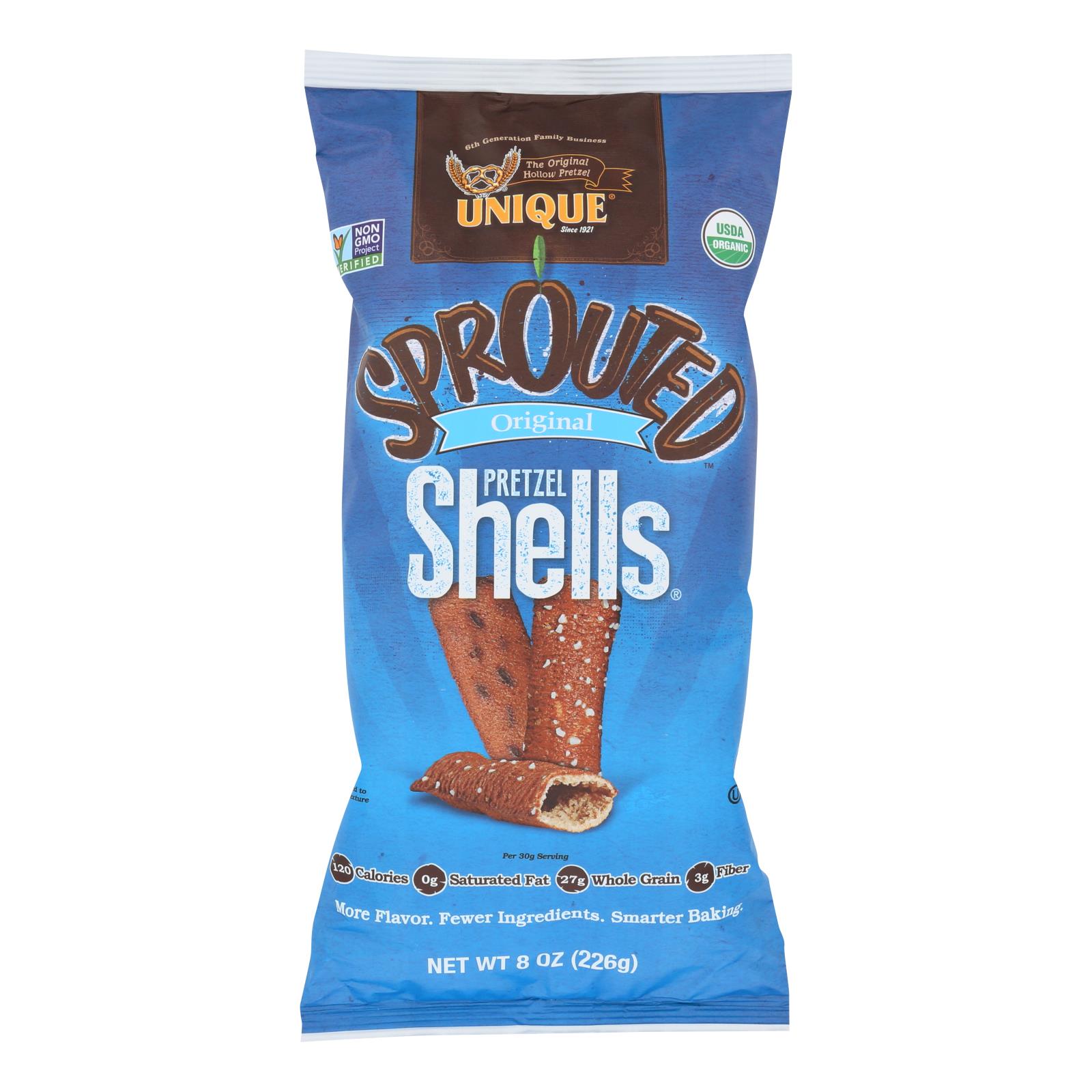 Unique pretzel bakery original sea salt, sprouted whole grain pretzel shells are a certified kosher snack. These pretzel shells come in one 8 oz. Bag. With pretzel splits, the inside of the pretzel has been removed, leaving only the shell. These contain no trans fat, are certified whole-grain, and are crunchy and light in texture. See nutrition facts panel for allergens.