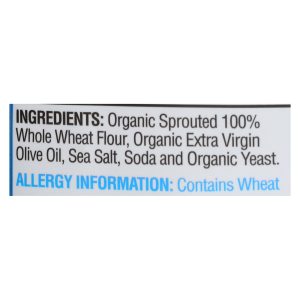 ingredients : organic sprouted 100% whole wheat flour;organic extra virgin olive oil;sea salt;soda and organic yeast