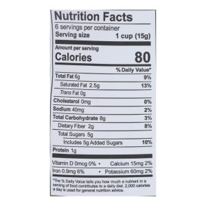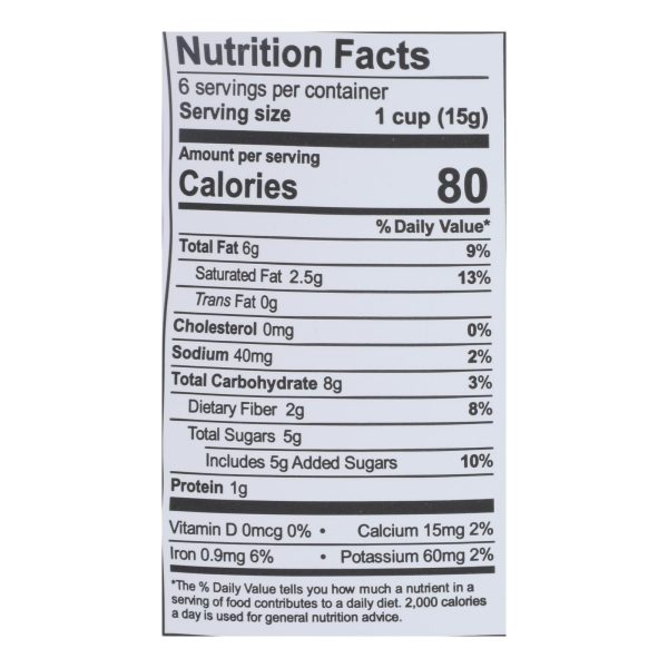 ingredients : dark chocolate (chocolate liquor , cane sugar , cocoa butter , organic blue agave inulin, sunflower lecithin, vanilla);almonds;organic cane sugar ;organic palm oil;organic blue agave inulin;organic coconut flour;sea salt;sunflower lecithin