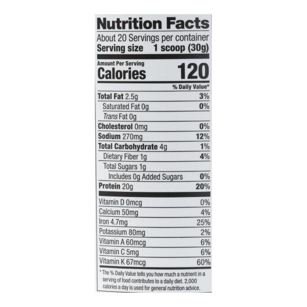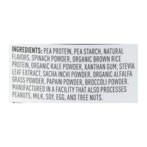ingredients : pea protein;pea starch;natural flavors;spinach powder;organic brown rice protein;organic kale powder;xanthan gum;stevia leaf extract;sacha inchi powder;organic alfalfa grass powder;papain powder;broccoli powder