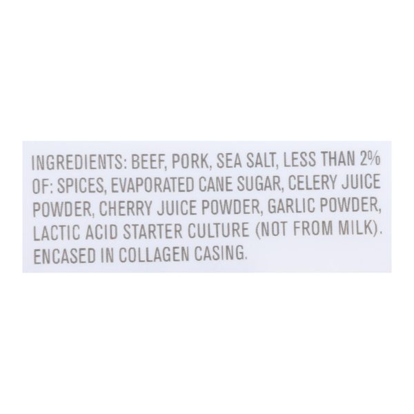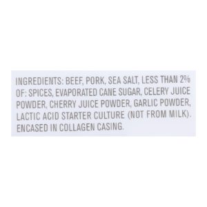 ingredients : beef;pork;sea salt;less than 2% of: spices, sugar, cherry powder, celery powder, lactic acid starter culture (not from milk), garlic powder;encased in colored (beta-carotene, caramel) beef collagen casing