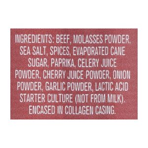 ingredients : beef;spices;molasses powder;sea salt;evaporated cane sugar;onion;celery juice powder;ascorbic acid;garlic;lactic acid starter culture;not from milk;encased in collagen casing