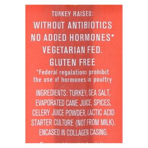 ingredients : turkey;sea salt;evaporated cane juice;spices;celery juice powder;lactic acid starter culture;not from milk;encased in collagen casing
