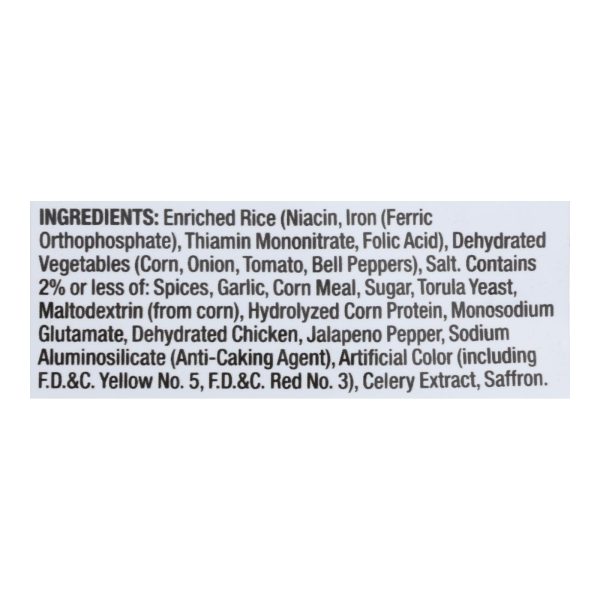 ingredients : enriched rice;niacin;iron;ferric orthophosphate;thiamin mononitrate;folic acid;dehydrated vegetables;corn;onion;tomato;bell peppers;salt. Contains 2% or less of: spices;garlic;corn meal;sugar;torula yeast;maltodextrin;from corn;hydrolyzed corn protein;monosodium glutamate;dehydrated chicken;jalapeno pepper;sodium aluminosilicate;anti-caking agent;artificial color;including f.d.&c. Yellow no. 5;f.d.&c. Red no. 3;celery extract;saffron