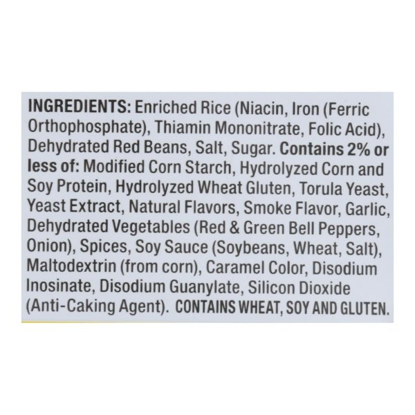 ingredients : enriched rice;niacin;iron;ferric orthophosphate;thiamin mononitrate;folic acid;dehydrated red beans;salt;sugar. Contains 2% or less of: modified corn starch;hydrolyzed corn and soy protein;hydrolyzed wheat gluten;torula yeast;yeast extract;natural flavors;smoke flavor;garlic;dehydrated vegetables;red & green bell peppers;onion;spices;soy sauce;soybeans;wheat;maltodextrin;from corn;caramel color;disodium inosinate;disodium guanylate;silicon dioxide;anti-caking agent