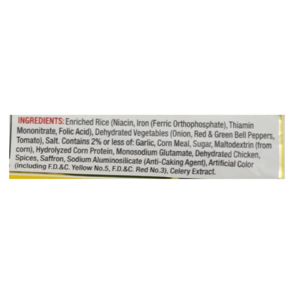 ingredients : enriched rice;niacin;iron;ferric orthophosphate;thiamin mononitrate;folic acid;dehydrated vegetables;onion;red & green bell peppers;tomato;salt. Contains 2% or less of: garlic;corn meal;sugar;maltodextrin;from corn;hydrolyzed corn protein;monosodium glutamate;dehydrated chicken;spices;saffron;sodium aluminosilicate;anti-caking agent;artificial color;including f.d.&c. Yellow no.5;f.d.&c. Red no.3;celery extract