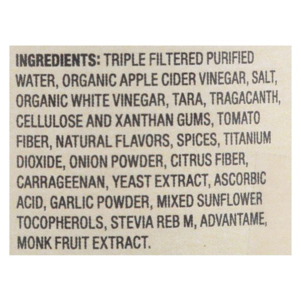 ingredients : water;organic apple cider vinegar;salt;organic white vinegar;tomato fiber;tara gum;natural flavors;monk fruit juice concentrate ;titanium dioxide (color);tragacanth gum;dried onion;citrus fiber;yeast extract;poppy seeds;celery seeds;mustard flour;ascorbic acid and mixed sunflower tocopherols to preserve freshness;gellan gum;dried garlic;xanthan gum;spice;stevia rebm