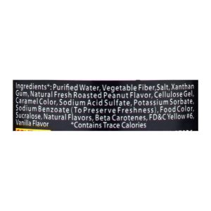 ingredients : water;salt;cellulose gel;natural and artificial flavors (sesame);cellulose gum;sugarcane fiber;caramel color;corn fiber;gellan gum;guar gum;xanthan gum;sodium benzoate;potassium sorbate and ascorbic acid to preserve freshness;sodium bisulfate;lactic acid;peanut extract;titanium dioxide (color);carob gum;carrageenan;canola lecithin;beta carotene color;sucralose;fruit and vegetable juice for color
