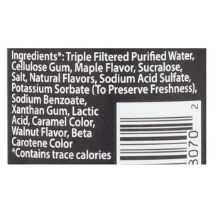 ingredients : triple filtered purified water;cellulose gum;maple flavor;sucralose;salt;natural flavors;sodium acid sulfate;potassium sorbate (to preserve freshness);sodium benzoate;xanthan gum;lactic acid;caramel color;walnut flavor;beta carotene color