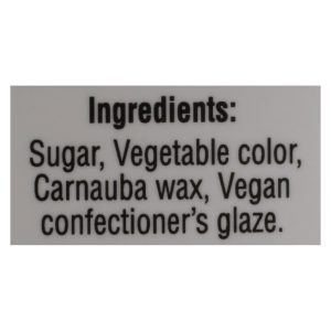 ingredients : sugar;vegetable color;carnauba wax;vegan confectioner’s glaze