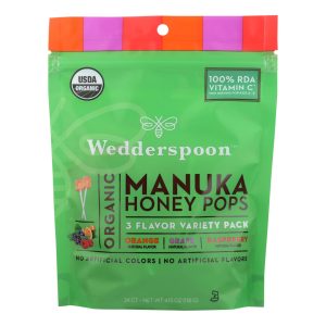 Wedderspoon organic makuna honey pops are natural honey lollipops that contain no artificial flavors or colors. Made with organic makuna honey, our 4.15 oz. Pack includes 24 pops in grape, orange and raspberry. They are a perfect treat for kids and adults alike. See nutrition facts panel for allergens.