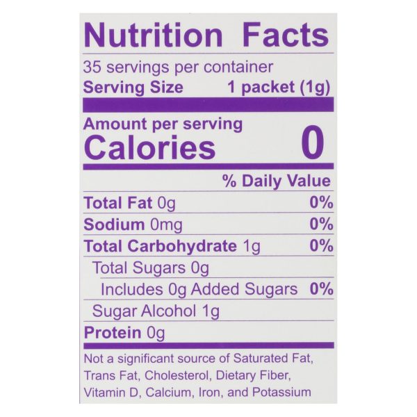 Wholesome! organic stevia zero calorie sweetener blend is made from certified non-gmo ingredients. This sweetener is low on the glycemic index and free of artificial ingredients. One teaspoon of organic stevia is equal to 2 teaspoons of regular sugar. Our zero calorie sweetener is naturally gluten-free and vegan. This box holds 35 individual packets of organic stevia zero calorie sweetener.