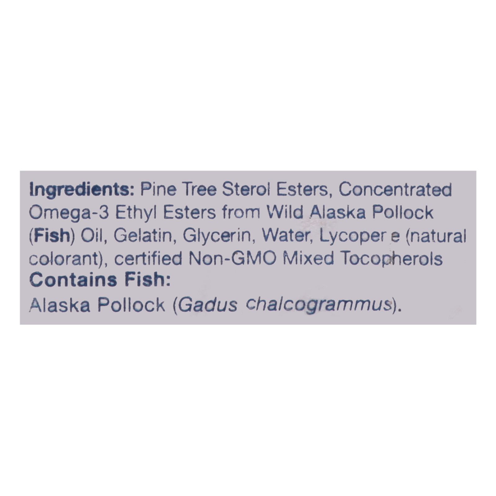 ingredients : pine tree sterol esters;concentrated omega-3 ethyl esters from wild alaska pollock (fish) oil;gelatin;glycerin;purified water;lycopene (natural colorant);mixed tocopherols (to preserve freshness)