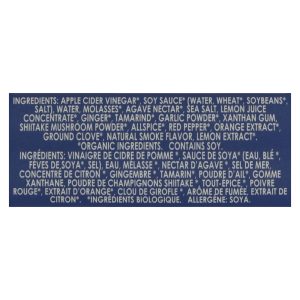 ingredients : apple cider vinegar;soy sauce* (water, wheat*, soybeans*, salt);water;molasses;agave nectar;sea salt;lemon juice concentrate;tamarind;ginger;garlic powder;xanthan gum;shiitake mushroom powder;allspice;red pepper;orange extract;ground clove;natural smoke flavor;lemon extract