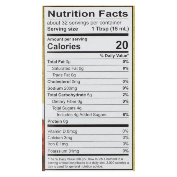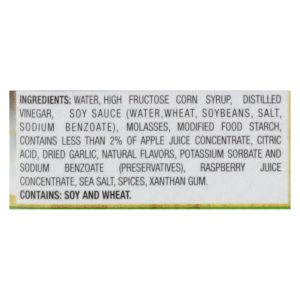 ingredients : water;high fructose corn syrup;distilled vinegar;soy sauce;wheat;soybeans;salt;sodium benzoate;molasses;modified food starch;contains less than 2% of apple juice concentrate;citric acid;dried garlic;natural flavors;potassium sorbate and sodium benzoate;preservative;raspberry juice concentrate;sea salt;spices;xanthan gum