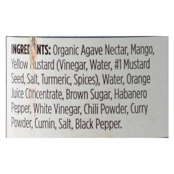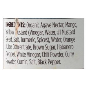 ingredients : organic agave nectar;mango;yellow mustard;vinegar;water;#1 mustard seed;salt;turmeric;spices;orange juice concentrate;brown sugar;habanero pepper;white vinegar;chili powder;curry powder;cumin;black pepper