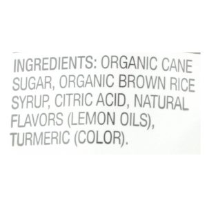ingredients : organic cane sugar;organic brown rice syrup;citric acid;natural flavors;lemon oils;turmeric;color