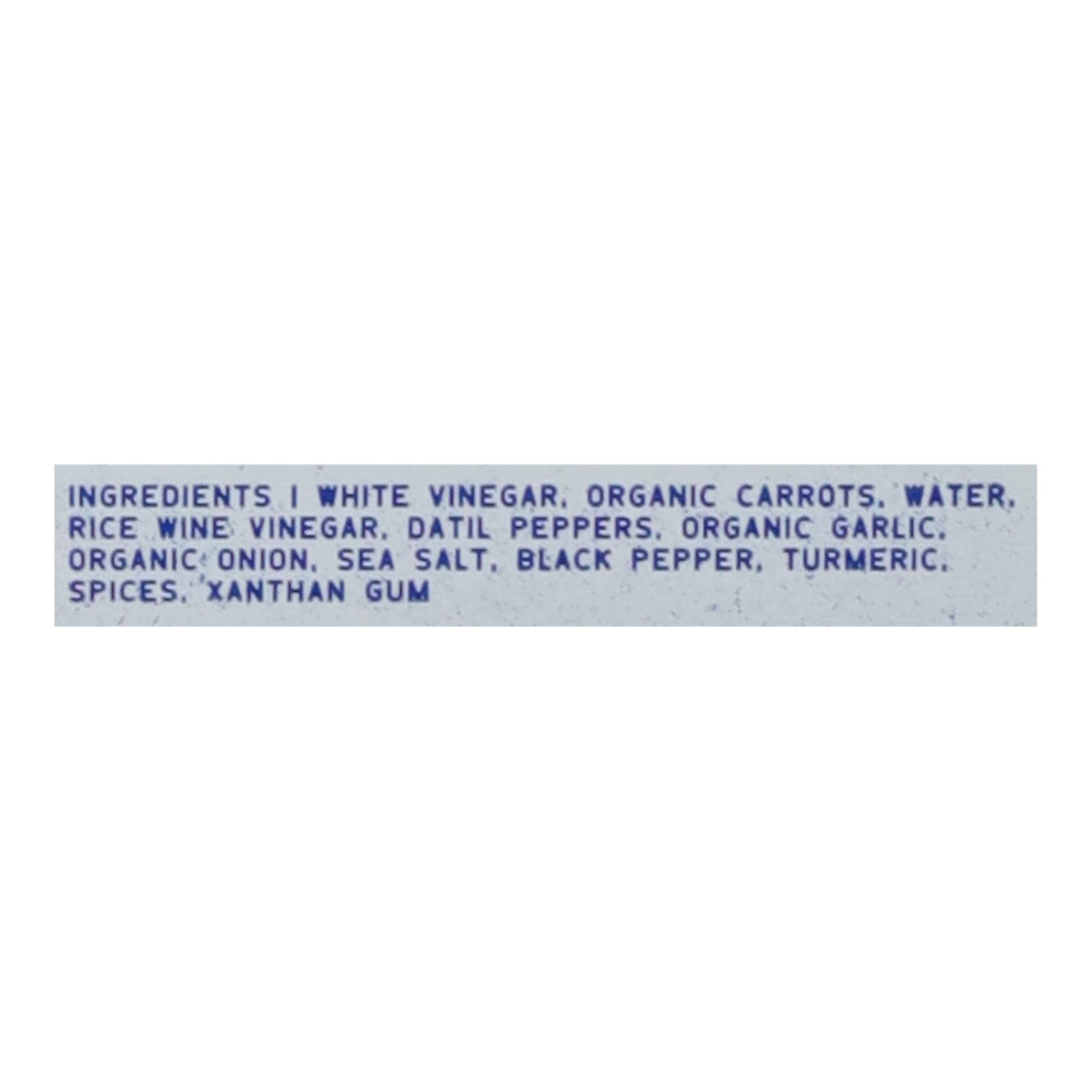 ingredients : white vinegar;organic carrots;water;rice wine vinegar;datil peppers;organic garlic;organic onion;sea salt;black pepper;turmeric;spices;xanthan gum